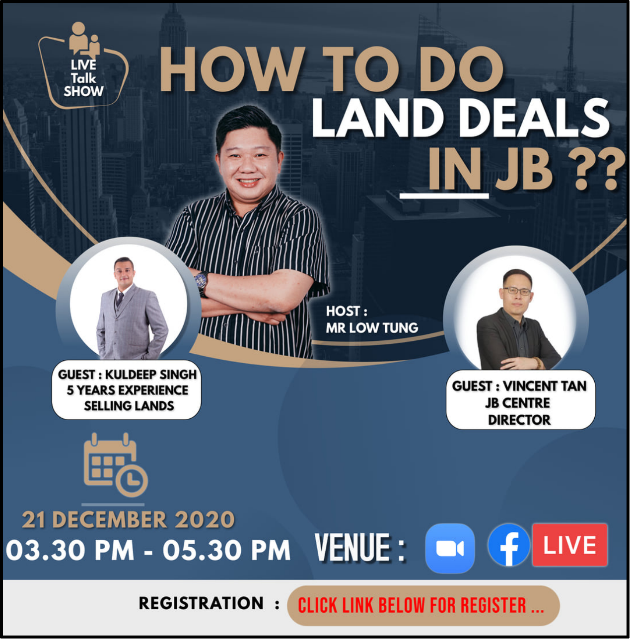 Topic: How To Do Land Deals In JB?Speaker : Mr. Low Tung, Mr. Kuldeep Singh, Mr. Vincent Tan