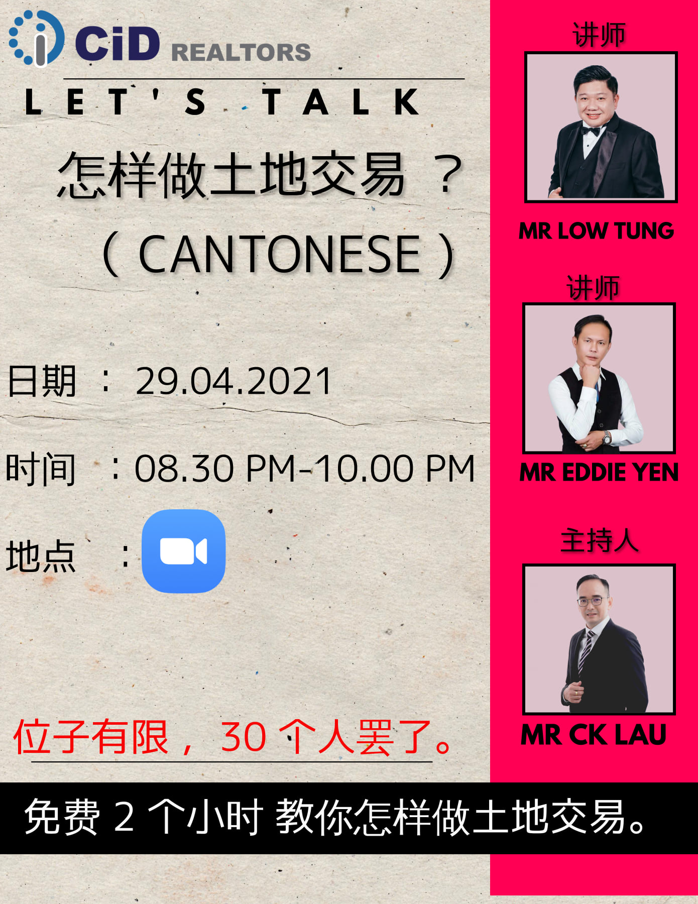 Topic: 怎样做土地交易Speaker: Mr Low Tung & Mr Eddie Yen